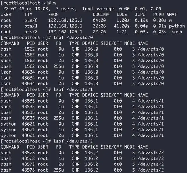 c. 通过查看/dev/pts下的进程,我们将可以了解到由登陆用户启动而非系统启动的进程有哪些。