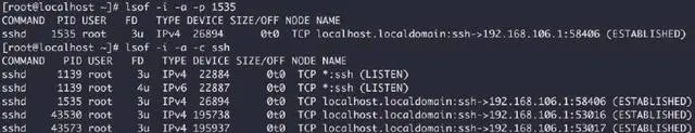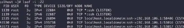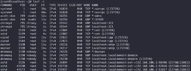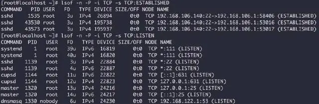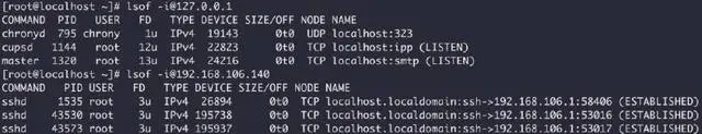 通过参数-i查看网络连接的情况,包括连接的ip、端口等;以及一些服务的连接情况,例如:sshd等。也可以通过指定ip查看该ip的网络连接情况。