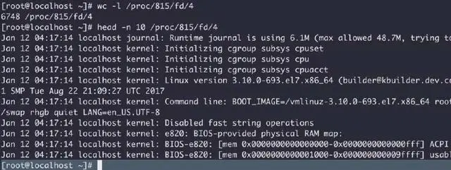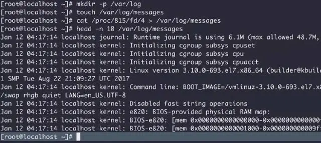 2.如果删除的文件还存在操作的进程,数据将可能被找回,可以在/proc/815/fd/4找到被删除的/var/log/messages文件;