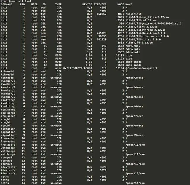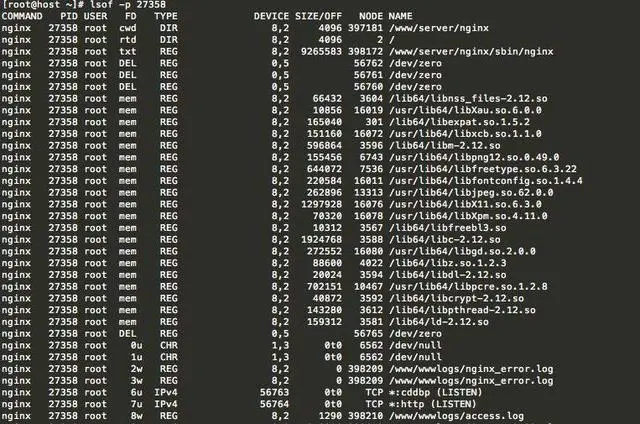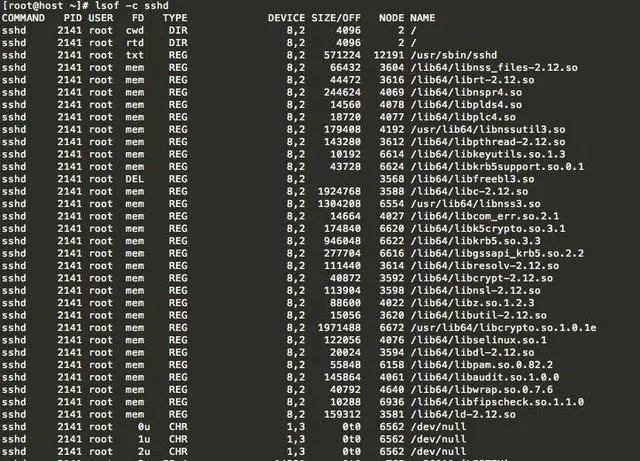 通过参数-c可以列出指定进程所打开的文件情况,以上是我们打开sshd下被打开文件的情况。