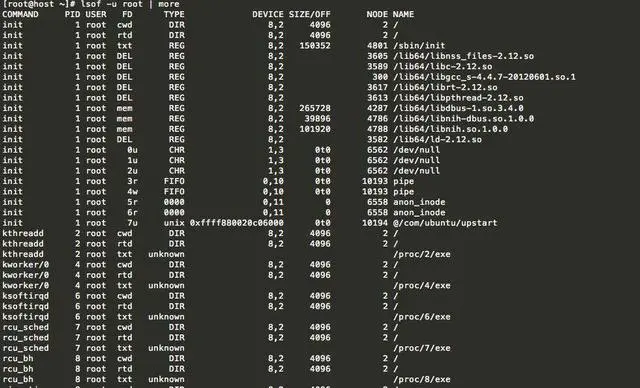 通过参数-u查看root用户下存在的文件情况,由于root下显示内容较多,可以利用more来限制,进行分页查看。